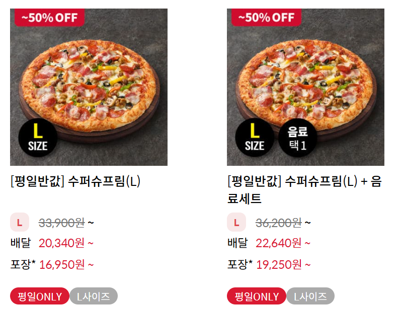 하지만 피자헛은 “평일 상시할인 50%”라는 점에서 눈에 띕니다.